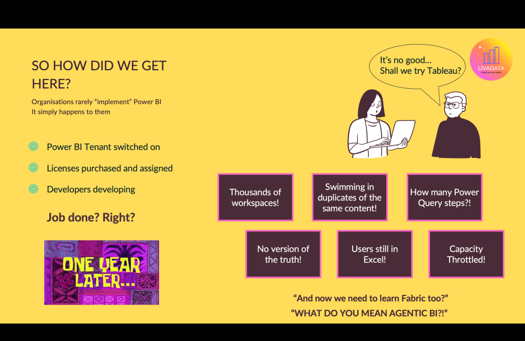 It’s no surprise that the default for some organisations in this scenario, on renewing their P SKU to an F SKU is “Turn Fabric items off… we don’t need to add any fuel to the fire!“. Fabric is seen as a new layer of ways things can go wrong. Show a BI team who are fighting fires in estates like this that AI innovation enables rapid development through Agentic BI, and you’ll likely be faced with exasperation or disillusion.