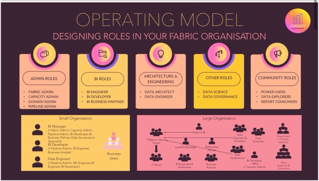 There is no magic answer, but understanding how this might take shape in a 3 person BI team versus a large organisation is key. Where in that small team, the most senior person is going to wear the hats of Fabric Admin, Capacity Admin, BI Business Partner, and Developer all in one, your large organisations will avoid a key person dependency like this.