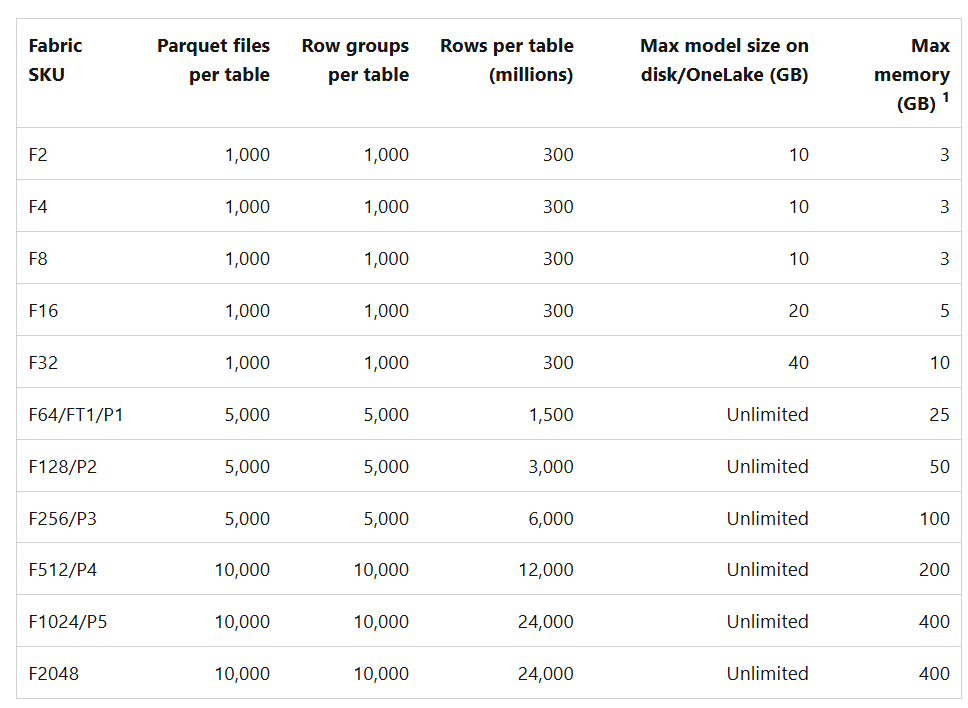 - Parquet files, row groups, and Delta log control how your data is organised into groups and how it performs. Note that your F SKU dictates the number of Parquet files, row groups and rows per table as well as the max model size and max memory.